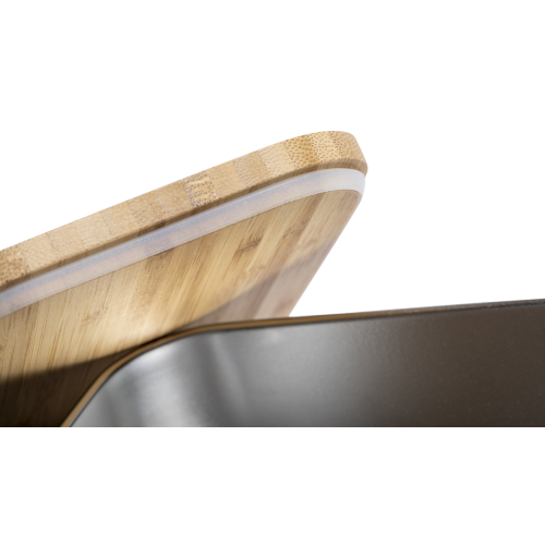 Sariul. Pudełko na lunch AP721819. Pudełko na lunch ze stali nierdzewnej z pokrywką z naturalnego bambusa. Ze sztućcami (nóż i widelec) oraz elastycznym paskiem. 600 ml.