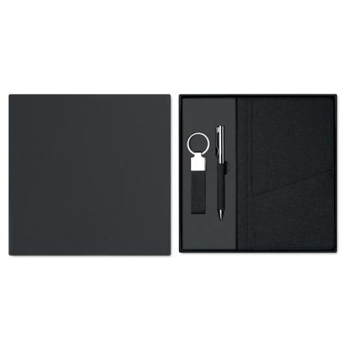 3-częściowy zestaw upominkowy w pudełku. Zawiera metalowy przekręcany długopis z detalami z poliestru RPET, notes w twardej okładce RPET z przednią kieszenią na smartfon oraz brelok z poliestru RPET. Niebieski tusz.