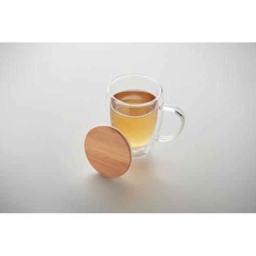 Kubek z podwójnymi ściankami ze szkła borokrzemowego z uchwytem i bambusową pokrywką. Pojemność: 250 ml.