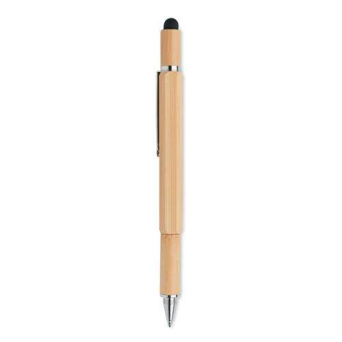 Wielofunkcyjny długopis bambusowy z poziomicą, z linijką 7 cm, rysikiem oraz końcówkami do wkrętarek krzyżakowych i płaskich. Niebieski tusz. Bambus jest produktem naturalnym, dlatego mogą wystąpić nieznaczne różnice w kolorze, wzorze i rozmiarze.