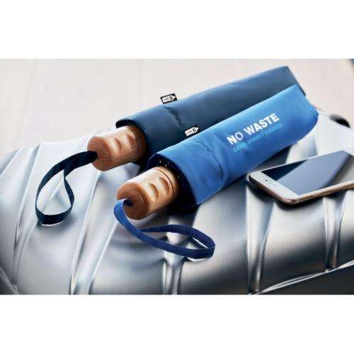 Składany parasol 21 cali, 3 sekcje z tkaniną pongee 190T RPET, czarny stelaż i żebra. Z drewnianą rączką. Ręczne otwierany i zamykany. Etui z tego samego materiału.
