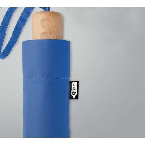 Składany parasol 21 cali, 3 sekcje z tkaniną pongee 190T RPET, czarny stelaż i żebra. Z drewnianą rączką. Ręczne otwierany i zamykany. Etui z tego samego materiału. Wymiary produktu: Ø99X58.5CM Materiał: Metal