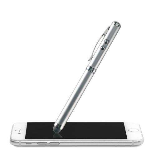 Wielofunkcyjny metalowy długopis: latarka LED (białe światło), wskaźnik laserowy (czerwony) i miękka końcówka. W metalowym pudełku. Czarny wkład. 3 baterie zegarkowe dołączone.