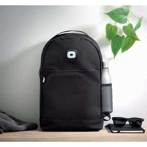 Plecak z 600D RPET. Przednia kieszeń zapinana na rzep. Lampka COB w kolorze białym z 3 różnymi ustawieniami jasności. Kieszeń z siatki z boku. W zestawie bateria.