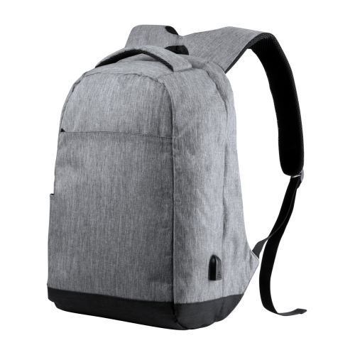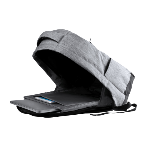 Plecak antykradzieżowy z wieloma przegrodami, wyściełanymi: miejscem na laptop (15”) i tablet (12”) oraz tylną ścianką i paskami. Z zapięciem do walizki i wbudowanym gniazdem USB do power banka. Poliester 300D.