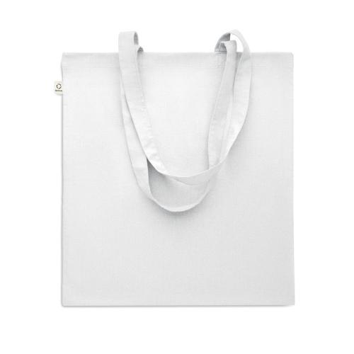 Bawełniana torba na zakupy z prekonsumenckiego recyklingu (70% bawełny z recyklingu i 30% RPET) z długimi uchwytami. 140 gr/m². Ten produkt może się kurczyć po zadrukowaniu.