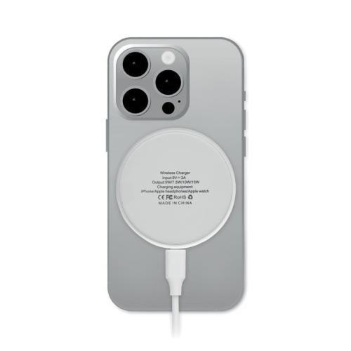 Bezprzewodowa ładowarka 3 w 1 o mocy 15 W. Zawiera magnetyczną ładowarkę bezprzewodową 15 W, ładowarkę do smartwatcha (tylko Apple®) i ładowarkę TWS. Długość kabla: 1M. Wejście: 2 w 1 Type-C i Type-A. Wymiary produktu: Ø6,5X0,8 CM Materiał: