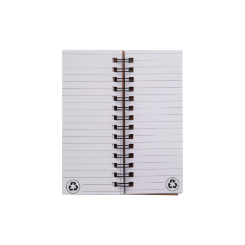 Notes spiralny z okładką z ekologicznego plastiku ze słomy pszenicznej, 40 kartek w linie z papieru z recyklingu, 25 karteczek samoprzylepnych i 125 zakładek (w 5 różnych kolorach). Z linijką 12 cm na okładce.