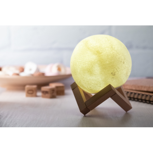 Głośnik bluetooth w kształcie księżyca na drewnianej podstawce. Z wbudowanym akumulatorem, podświetleniem LED (ciepłe i zimne światło z regulacją natężenia). Zawiera kabel USB.